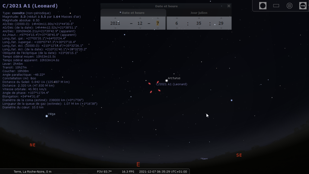 La comète C/2021 A1 Leonard découverte le 3 janvier 2021 approche de la Terre. Son passage au plus près de notre planète est prévu le 12 décembre 2021 à 35 millions de kilomètres seulement. Cela donnera peut-être un beau spectacle car sa magnitude pourrait atteindre 4, ce qui la rendrait visible à l’œil nu. Mais attention, son passage sera rapide : avant le 1/12 la Lune sera encore gênante, et à partir du 13/12 elle sera déjà probablement trop proche du soleil pour être bien visible. Il ne reste qu’une courte fenêtre d’observation d’une douzaine de jours pour espérer la voir à l’oeil nu ou plus probablement aux jumelles. Il faudra la chercher le matin à l’Est en utilisant un logiciel de carte du ciel ou les cartes publiées par Laurent Ferrero sur son blog :