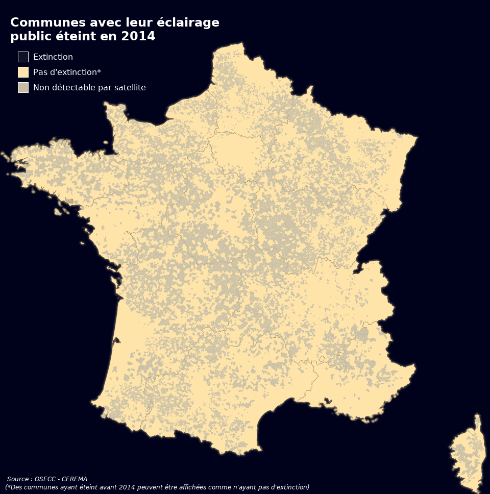 Basée sur l’analyse de données satellitaires, elle permet d’observer l’évolution dans le temps des pratiques d’éclairage public de plus de 19 000 communes de l’Hexagone, entre 2014 et 2024. Les données référencent les pratiques d’extinctions totales, partielles et les rénovations d’ampleur du parc d’éclairage. Elles permettent de constater la mise en place, la poursuite ou l’arrêt de politique d’extinction en cœur de nuit.