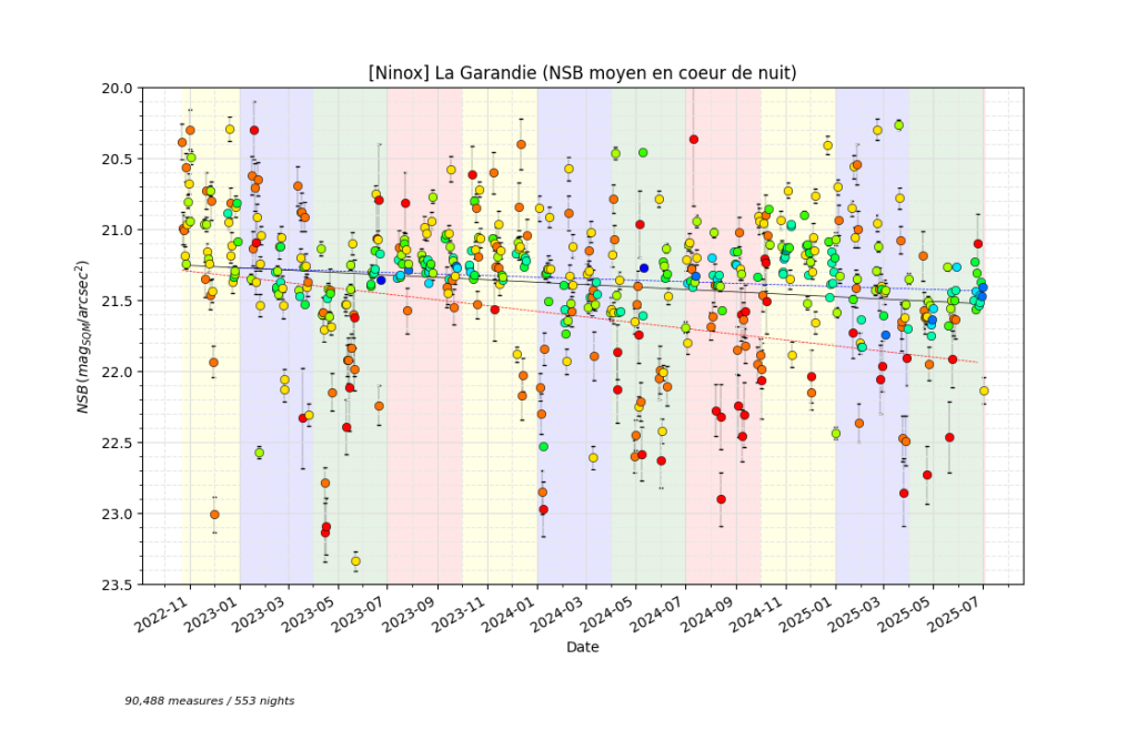 L’analyse des données enregistrées entre octobre 2022 et juillet 2025 sur le site de l’observatoire de la Garandie démontrent une amélioration d’ensemble de la noirceur des nuits. Le graphique suivant permet de le visualiser (puisque la lecture d’un tel graphique n’est pas évidente, nous vous donnons juste en-dessous les clés de lecture et d’interprétation pour vous en faire une meilleure compréhension).