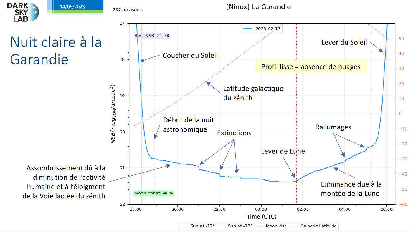 Une présentation publique a été donnée en juin 2023 à la 4A, concluant sur 8 mois d’enregistrements continus de la qualité du ciel de notre site d’observation : télécharger la présentation. L’impact bénéfique des extinctions nocturnes environnantes y est en particulier mis en évidence.