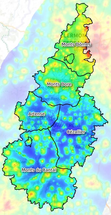 Suite à sa campagne de mesures, le Parc Naturel Régional des Volcans d’Auvergne a mis en ligne la cartographie de la pollution lumineuse sur tout le territoire du parc. La carte est disponible sous ce lien : https://carto.parcdesvolcans.fr/lizmap/index.php/view/map/?repository=05&project=pollution_lumineuse